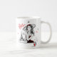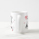 A ilustração elegante de uma mulher de grande brilho teve café bebendo em Paris com a Torre Eiffel ao fundo. Acentos vermelhos.