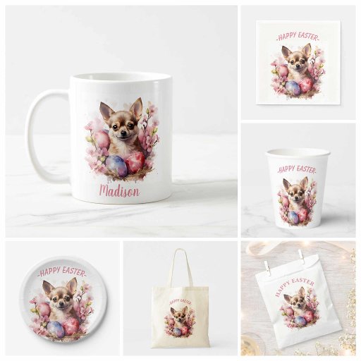 Mug apresentando um Chihuahua com flores e ovos de Páscoa. Personalizável.