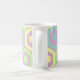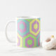 Esta caneca tem um design geométrico de hexágonos em azul pálido, amarelo pálido e verde pálido em um campo de listras em rosa pálido e roxo pálido.