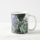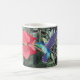 Esta caneca colorida apresenta um design de um Hummingbird azul e verde alimentando-se de um hibisco vermelho, contra um fundo tropical.