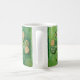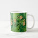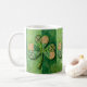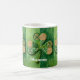 Three shamrocks, made of green and tan patchwork, on a background of two tones of green, make a beautiful Irish-themed St. Patrick's Day mug.