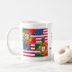 Caneca de café PORTUGUESA HERITAGE AMERICANA, Patriótica, mostrando a bandeira de PORTUGAL e a bandeira Estrelas e Stripes dos ESTADOS UNIDOS DA AMÉRICA, conectada em formas de peças de serra. O design é repetido no sentido inverso, e no meio há um texto que lê CELEBRATING PORTUGUESE-AMERICAN HERITAGE mais um nome de marcador. Todo o texto é PERSONALIZÁVEL, para que você possa criar sua própria mensagem e adicionar seu nome. Especialmente concebido para comemorar o Dia de Portugal e os eventos do Patrimônio Português. Itens correspondentes disponíveis, para que você possa comemorar seu evento no estilo.