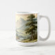 Lithochromographie montrant un paysage bucolique dans un style pictural classique. On y voit trois maisons traditionnelles avec des toits rouges situées sur une colline douce. Au premier plan, une rivière serpente à travers le paysage. En arrière-plan s'élèvent des montagnes majestueuses sous un ciel lumineux aux nuages délicats. Des arbres feuillus encadrent la scène, créant une atmosphère paisible et idyllique.