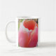 Close up cor-de-rosa peachy delicioso da tulipa em cada lado da caneca branca