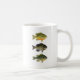 Esta caneca de café de pesca de água fresca exibe três dos mais coloridos peixes do sol da América do Norte; a planta azul, a semente de abóbora e os peixes do sol mais longos. Também conhecido como brea, perca-do-sol, ensolarado e outros nomes, os peixes do sol são pequenos e atraentes pântanos.