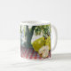 As peras suculentas sentam-se na mesa piquenique sob a sombra vestida de uma árvore. O original é uma pintura em miniatura de óleo por Kathie Miller