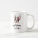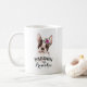 Esta caneca adorável tem um cachorrinho branco e castanho-claro, Cachorro francês com um pequeno buquê de flores roxas, cor de pêssego, e cor de água verde e folhas sentadas em sua testa. O texto personalizável diz "Perdoe meu francês".