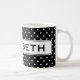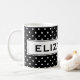 Caneca de café personalizada com bolinhas. Bela ideia de presente de monograma para mulheres. Design de padrão polkadots preto e branco. Cor de fundo personalizável.