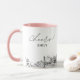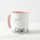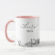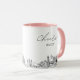 Caneca de café para casamento em Virginia Beach. O design exibe um esboço deslumbrante da linha do horizonte com a capacidade de personalizar com seu nome ou os nomes das damas de honra, convidados ou outros. Atualize facilmente o tamanho e a cor da caneca ao seu gosto.