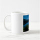 Uma caneca com uma bela fotografia de um píer de madeira esticando-se sobre um lago calmo. O céu noturno coberto de estrelas e uma bela lua de cheio.