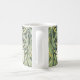 Uma caneca de café de arte com o padrão de William Morris (1834-1896), Pimpernel (1876) do período das artes e artesanatos. Bolhas brancas com folhas verdes e flores amarelas de pâncreas.