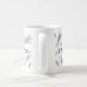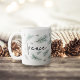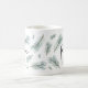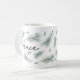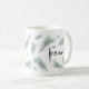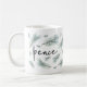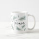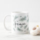 Design de caneca de férias moderna e festiva apresenta "paz" em letra manuscrita chica, rodeada por ilustrações de tosse de pinheiro aquoso em verde-espirroso.