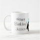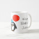 Pinguim caneca de aniversário com balão vermelho e nome. Design personalizável com um desenho engraçado de pinguim vestindo um chapéu de festa e segurando um balão.