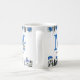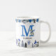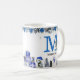 Uma caneca de natal azul, bonita, com flores e folhagem elegantes de Natal, adoráveis pinguins de bebê, bonitão, presentes, sua inicial e nome.