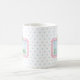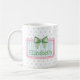 This cute ceramic mug features a pink frame with blue and white stripes and topped with a preppy green and white gingham plaid bow on each side on a background of light blue polka dots. Personalize with your choice of name or special text on the front and back. Fun for personalized party favors and gift bags.