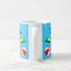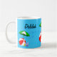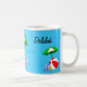 Adicione o seu nome em ambos os lados da caneca com texto maior e praia divertida ou piscina de natação arte temática de uma bola vermelha de praia, guarda-chuva verde, sandálias de férias e óleo de bronzeado de sol em um fundo azul-d'água com ondas encaracoladas.