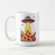 Um disco voador raptando uma fatia gigante de pizza de pepperoni com um feixe de queijo brilhante, estilo de desenho animado, cores vibrantes, fundo cósmico, vibrações retrorreflectoras.