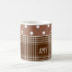 Copo de café customizável. Faiança branca com as bolinhas cacau-marrons e brancas justapor com xadrez mocha-marrom. Personalize suas nome ou iniciais no quadrado. Escolha mesmo uma pia batismal diferente!