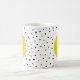 Caneca monográfica brilhante e moderna, com bolinhas pretas, com etiqueta amarela. Esta caneca feminina personalizada será perfeita como presente.
