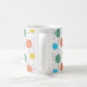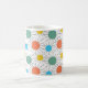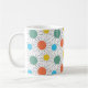 Esta caneca tem uma design moderna de médio século com círculos atrás em laranja, amarelo, turquesa e verde.