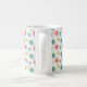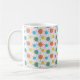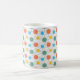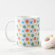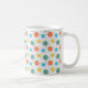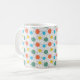 Esta caneca tem uma design moderna de médio século com círculos atrás em laranja, amarelo, turquesa e verde.