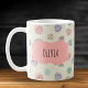 Esta caneca personalizada adorável apresenta rabiscos de corações simples, pontos e linhas onduladas pintadas com aquarelas macios em rosa-pincel, verde-menta, lavanda e amarelo-pálido.