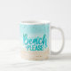 Esta caneca de café engraçada apresenta fundo azul turquesa e aquarela bege com acentos brilhantes e texto "Praia, por favor" em letras aqua cintilantes. Adicione seu nome ao lado para personalizar. Perfeito para o café da manhã enquanto observava as ondas.