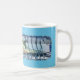 Copo de cerâmica legal, com arte gráfica de um grande tubarão branco preso em uma garrafa de água, contra um fundo de ondas azuis em espiral. Personalize para adicionar seu próprio texto.
