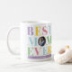 Perfeito como presente de dia de as mães, esta caneca personalizada apresenta o texto "melhor mãe de todos os tempos" em roxo lilás brilhante e brilhante, robins azul-ovo, amarelo ensolarado, verde-grama e rosa bonito e mantém sua mãe no centro do show com uma foto e uma mensagem editável abaixo dela. Ela vai alegremente se abastecer por seu dia sabendo que é amada e apreciada.