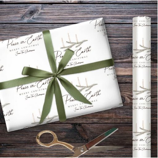 Paz Personalizada na Terra - Mug de Café Presente no Natal. Mostrado em verde, marrom e bronzeado em um fundo branco, mas todas as cores são editáveis. Escrito manual elegante com velas e galhos verdes desenhados à mão. Personalize a modelo para adicionar um nome ou texto vertical personalizado ao lado da caneca. © Kimbellish, LLC