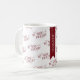 Design de caneca de café sazonal moderna, de cor vermelha e branca festiva, apresentando um padrão elegante de tipografia de 'Feliz e Brilho' e uma fita vermelha mínima com espaço para o seu nome ou texto personalizado - o estocador perfeito ou presente para um ente querido.
