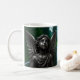Estátua de anjo escuro com olhos brilhantes numa estrada florestal reflexiva, caneca de fantasia gótica, dom único perfeito. Anjo gótico com olhos brilhantes numa estrada florestal - uma caneca fantasia mística que inspira força e mistério, perfeita como um dom único.