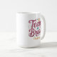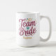 Nossa caneca de café personalizada apresenta a frase "equipe da noiva" em tipografia brilhante com elementos caprichosos em burgundy, aqua e dourado para um presente divertido para suas damas de honra celebrarem você na sua era de noiva!