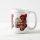 Linda caneca com estoque vermelho de cebola natalícia com broca de ouro e fita vermelha brilhante de cetim. A caixa de presentes tem bonito frutas vermelhas, agulhas de pinheiros e flores brancas com uma bela fita vermelha de cetim. Conteúdo genérico