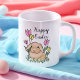 Esta adorável caneca de Felz pascoa apresenta uma ilustração bonita de coelho com flores de primavera e grama.