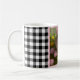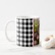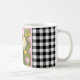 Bonito caneca de café apresenta uma pintura digital de um pintinho bebê entre flores cor-de-rosa e amarela com fundo de verificação de gingham preto e branco.
