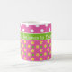 Uma bonito, cor-de-rosa, branca e verde Coffee Mug para personalizar, com uma mistura de padrões grandes de bolinhas brancas em cor-de-rosa profundo e um padrão mini-impressão de primatas amarelos e bolinhas verdes, também em cor-de-rosa profundo. Parte da coleção "Primroses" de Posh & Painterly.