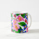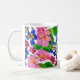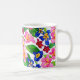 Uma clássica caneca branca de 11 oz com um padrão pintado de borras cor-de-rosa e azuis. Micro-ondas e máquina de lavar louça em segurança. Consulte também cartão de saudação, presentes e roupa.