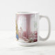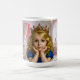 Caneca artística com uma garota loira com uma coroa de joias em um quarto de dormir sonhador no palácio rosa, simbolizando inocência, beleza e imaginação real.