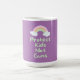 Caneca de café com texto "Proteger Crianças Não Armas" no estilo de letra verde da casa da moeda e gráfico arco-íris pastel.