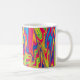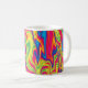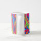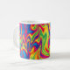 Uma caneca com um design psíquico colorido e abstrato com padrões ondulantes.