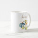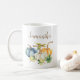 As belas abóboras de aquarela em tons de azul, laranja e branco são apresentadas nesta caneca sazonal. Você pode personalizar o nome que está em ambos os lados da caneca. Aprecie seus convidados e sua família para cair e Ação de Graças com esta caneca de abóbora.