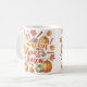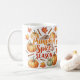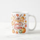 Traga sabores de outono para o café com esta design de caneca de pelúcia. Texto manuscrito a na moda em vermelho laranja e rústico, rodeado por abóboras aquáticas, varas de canela, folhas de maple e uma ilustração acolhedora do cachecol. Uma caneca de outono para amantes de picles de abóbora.