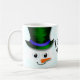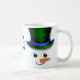 Uma bela ilustração do rosto de um boneco de neve vestindo um chapéu verde festivo, fundo de neve e tipografia personalizável, ideal para chocolate quente, decoração de férias ou presente de Natal muito bonito.