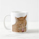 gato de gato malhado alaranjado que faz uma cara da língua em um copo de café/caneca