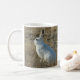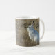 Caneca com legenda Lebre-da-neve. Às vezes, até mesmo os planos da mãe natureza podem ser atrapalhados pelo clima, esta lebre-da-neve mudou para o seu casaco branco de inverno, mas as neves de inverno estão atrasadas e em vez de estar camuflada, agora se destaca contra as gramíneas marrons da pradaria.