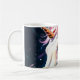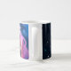 Uma caneca de café unicórnio cor-de-rosa contra um céu noturno cheio de estrelas.