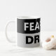 Uma caneca de café branca, prateada e preta, a preto e a rolo, de um baterista, de um batedor de tambor ou de um músico de percussão, com as palavras MEDO DOS DROGAS. Projetado por Heard_. Veja mais designs na minha loja do Zazzle, Heard_, aqui: https://bit.ly/3aGBOO6 #PresentsForDrummers #DrummerGifts #Drummer #Percussionista #MarchingBand #MusicialCoffeeMug