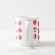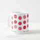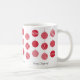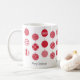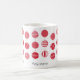 Uma caneca com bolas de Natal vermelhas e brancas e um texto "Feliz Natal". Personalize a caneca com seu próprio texto, cor de fundo entre outras opções.