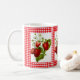Decorre sua cozinha para a temporada de verão com esta caneca de café padrão gingham de querido/ Esta caneca apresenta um padrão de gingham vermelho e branco com cobertura de planta de morango de árvore. A planta de morango tem morangos vermelhos, folhas verdes e flores brancas. Esta caneca cumprimentará uma cozinha branca clássica que apresenta decoração no estilo country.